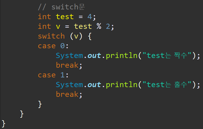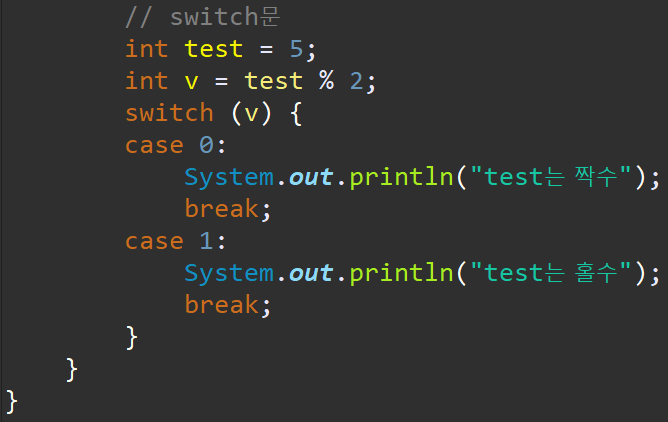 그리고 switch 문에서 변수 v가 0이 나오는 경우는 짝수, 1이 나오는 경우는 홀수라는 출력값이 나오게 했다.