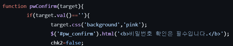 문구를 띄우는 함수 안에 플래그를 같이 넣고 회원가입 버튼을 눌렀을 때 플래그의 최종 상태를 보고 유효성 체크를 하게끔 구현하였다.